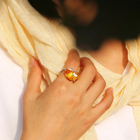 Embrassez la nature avec cette bague ambre qui capture l'esprit de la forêt.