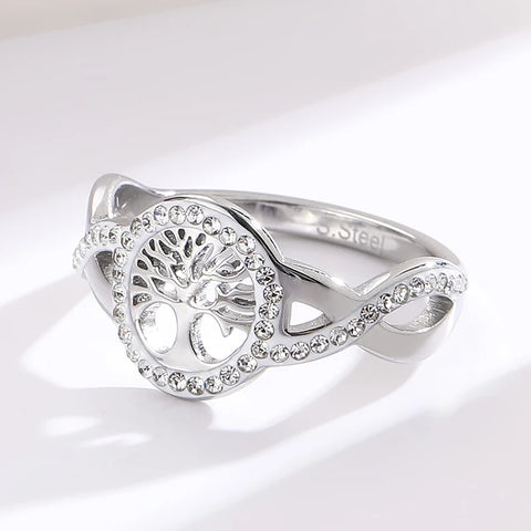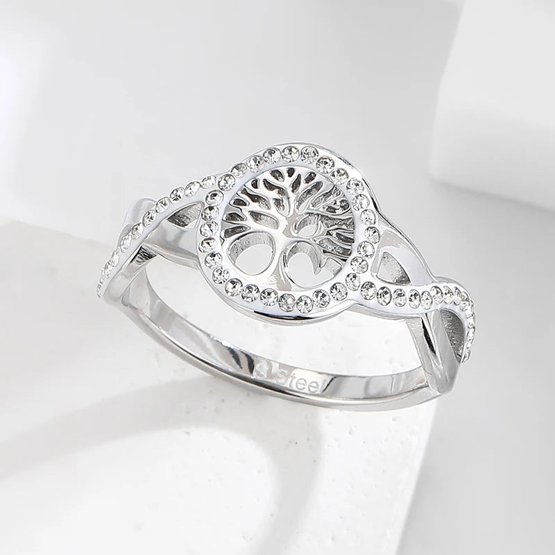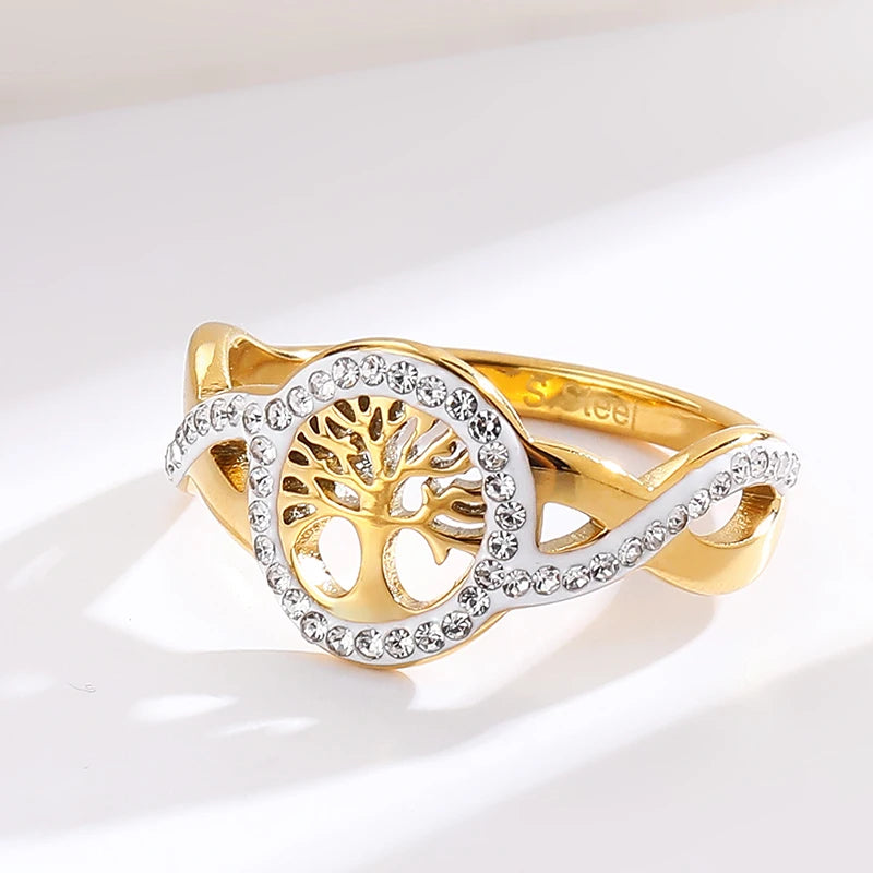 Découvrez cette bague arbre de vie, un bijou qui allie un design spirituel à une finition moderne. Son corps, un anneau en spirale qui s'entrelace, est orné de zircones scintillantes. Au centre, un médaillon ajouré de couleur dorée, sur lequel est sculpté un arbre de vie, est la pièce maîtresse du bijou. Le médaillon est orné de petits cristaux, pour ajouter un éclat subtil.