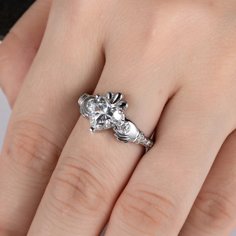 Cette gemme est délicatement couronnée, tandis que ses côtés sont flanqués de deux mains sculptées retenant le cœur, une représentation classique du motif Claddagh, enrichie de diamants d'imitation étincelants. L'anneau lui-même n'est pas en reste, orné de petites pierres scintillantes qui prolongent le luxe sur les épaules de la bague, conférant à l'ensemble un faste digne des plus grandes histoires d'amour.