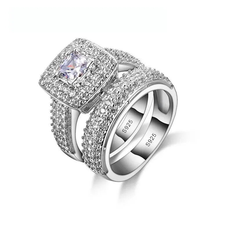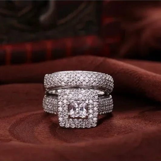 Cet ensemble de deux anneaux, une bague de fiançailles et alliance assorties, est l'incarnation de l'élégance et du raffinement. Les deux bagues sont conçues en argent 925 sterling et sont ornées de pierres de zircone cubique de haute qualité qui brillent comme de véritables diamants. L'anneau solitaire est doté d'une grande pierre principale, ce qui la rend éblouissante. L'alliance, de son côté, est un anneau fin, orné d'une ligne de petites pierres.