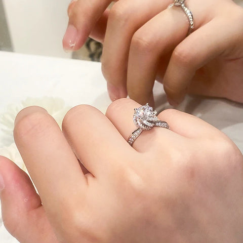 Cette bague de mariage se distingue par son design somptueux, où une pierre centrale massive, d'un brillant spectaculaire, est mise en majesté par un sertissage à six griffes qui la soulève et maximise sa réfraction lumineuse. Les épaules de l'anneau, légèrement courbées, sont pavées de petites pierres étincelantes, formant une alliance harmonieuse et sophistiquée. L'effet est celui d'une rivière de lumière qui monte vers le solitaire principal. L'anneau présente une finition polie miroir, reflétant la lumière et accentuant la brillance des pierres.