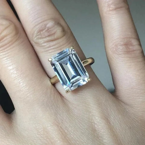 Cette coupe rectangulaire, reconnue pour ses facettes en escalier, captive le regard par ses jeux de lumière subtils et ses flashs distincts, offrant une allure à la fois classique et résolument moderne. Le corps de bague est délicat, soulignant l'importance de la pierre tenue fermement par quatre fines griffes, une configuration qui maximise l'exposition à la lumière pour un scintillement accru.