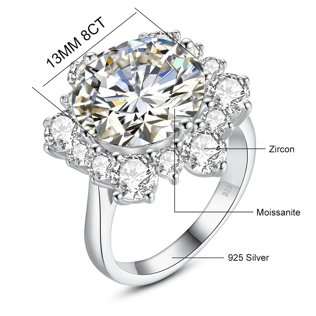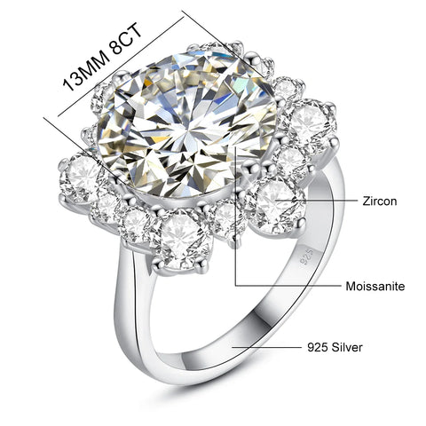 Le cœur de ce bijou est une magnifique Moissanite de 8 carats, la pierre principale réputée pour son feu et son éclat qui surpassent ceux du diamant. Elle est merveilleusement accompagnée de Zircons qui forment la corolle latérale, ajoutant une lumière supplémentaire au design en fleur. L'ensemble a un poids agréable de 6,7 grammes, assurant une présence confortable et luxueuse à votre main.