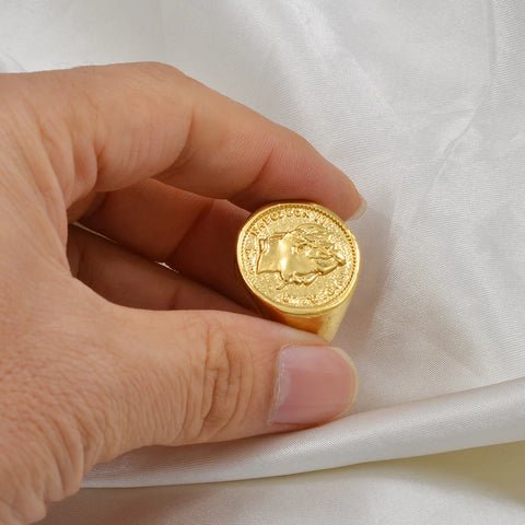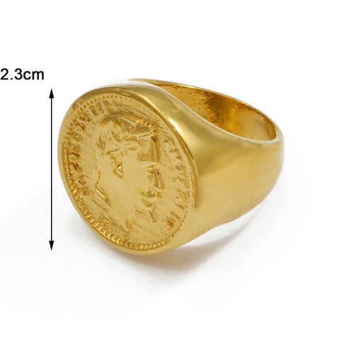 Découvrez la beauté captivante de cette bague Napoléon au design unique. Son motif central, finement sculpté, reproduit une pièce de monnaie avec le portrait de Napoléon et la couronne d'une figure historique. La pièce de monnaie, de couleur dorée, est sertie sur un anneau en cuivre qui est également de couleur dorée. L'anneau, lisse et brillant, s'accorde parfaitement avec la pièce, créant un bijou à la fois élégant et puissant.