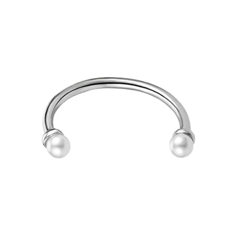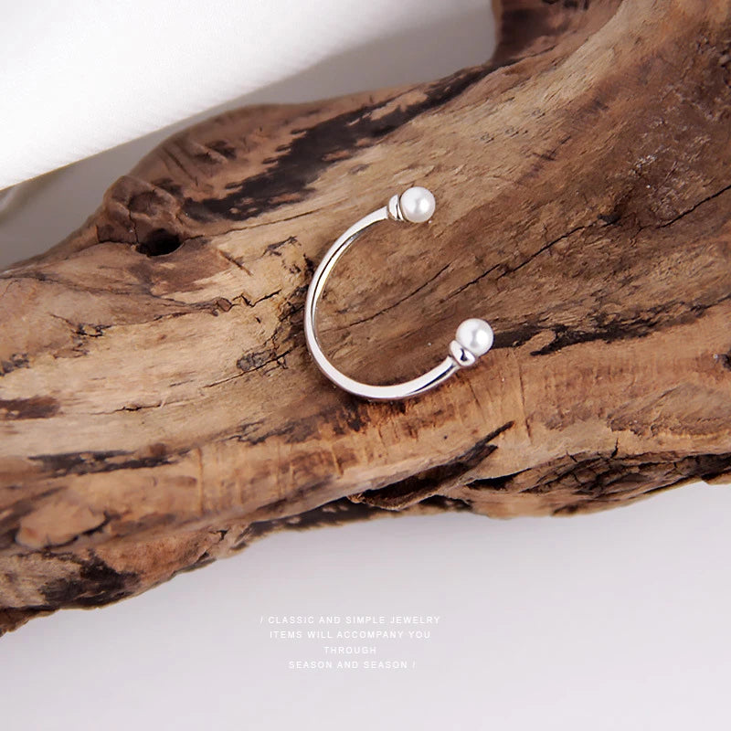 Ce bijou unique, que nous mettons en avant ici, arbore une silhouette minimaliste en forme de manchette ouverte, se terminant gracieusement par deux perles rondes et lumineuses. Ces perles, d'un blanc pur, créent un contraste saisissant avec l'éclat poli de l'argent, conférant à la bague un charme à la fois classique et contemporain.