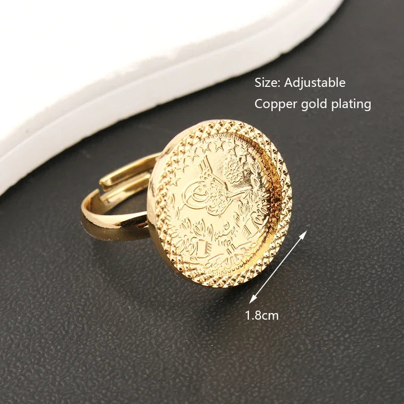 Le modèle que nous vous proposons se distingue par son design audacieux et sa finition dorée brillante. Il arbore fièrement une imitation de monnaie ou de sceau, dont le motif central est finement ciselé, ajoutant une profondeur et une authenticité remarquables. Autour de ce motif historique, un contour délicatement festonné encadre la pièce, renforçant l'effet visuel d'une véritable pièce ancienne. La monture, simple et épurée, met en valeur le plateau circulaire et son éclat, créant un contraste saisissant qui souligne le caractère unique du bijou.