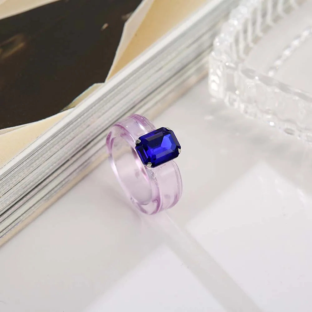 Le point fort de ce modèle réside sans conteste dans la pierre synthétique facettée qui orne le dessus de l'anneau, offrant un contraste saisissant avec la translucidité de la matière principale. Sur l'image, vous pouvez admirer le modèle jaune orné d'un superbe "diamant" mauve, le violet sublimé par une pierre bleu profond, et l'anneau bleu ciel rehaussé d'une touche de rose poudré. Ces joyaux rectangulaires aux angles nets captent merveilleusement la lumière, créant un éclat subtil et sophistiqué, loin de l'aspect simpliste qu'on pourrait attribuer à une bague plastique. Elles sont l'incarnation d'un chic décontracté, parfait pour toutes celles qui aiment marier le confort à la mode.