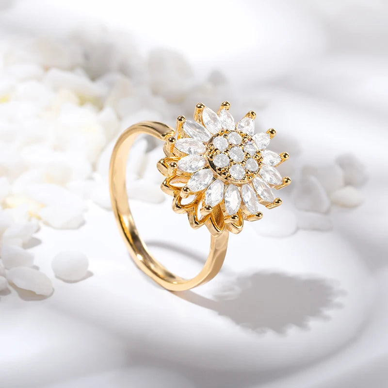 Laissez-vous charmer par la délicatesse de notre bague "Fleur de Soleil", une pièce d'exception qui allie élégance et bien-être. Conçue pour apaiser votre esprit tout en rehaussant votre allure, cette bague qui tourne est bien plus qu'un simple bijou. Admirez ses pétales scintillants qui captent la lumière à chaque mouvement, offrant un spectacle hypnotisant.