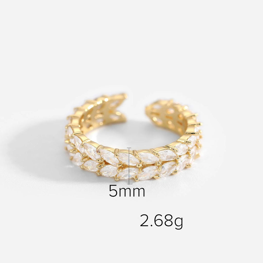 Le modèle phare, visible en grand, se distingue par son ouverture contemporaine et sa ligne de zircons étincelants taillés en baguettes. Ces pierres rectangulaires, d'une clarté impressionnante, sont solidement serties, offrant un scintillement digne des plus grandes joailleries. Cet anneau au design affirmé est l'accessoire idéal pour celles qui aiment les pièces fortes.
