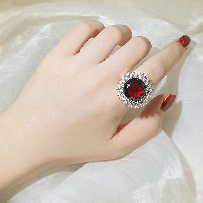 L'effet est spectaculaire, chaque petit zircon scintillant comme un diamant, contrastant magnifiquement avec la richesse chromatique de la pierre rouge. Le sertissage en griffes maintient solidement les pierres tout en ajoutant une touche délicate et ouvragée à l'esthétique générale de cette bague qui rappelle les bijoux de famille. Pratique et pensée pour toutes, cette pièce bénéficie d'une taille ajustable, vous garantissant un ajustement parfait sans avoir à vous soucier des mesures.