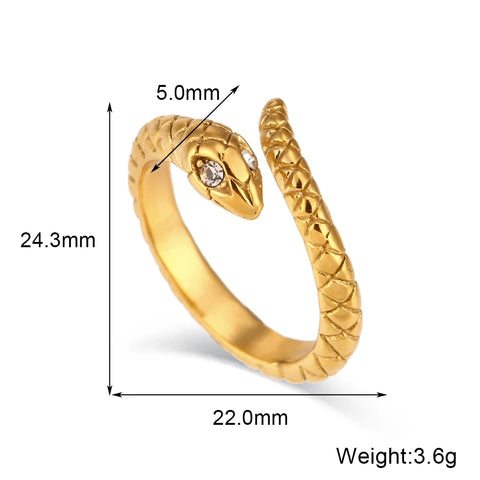 La conception de cette magnifique bague serpent or est un hommage à l'élégance animale. Le serpent, dont le corps est minutieusement ciselé pour imiter ses écailles, s'enroule de manière fluide, créant un design ajustable qui s'adapte parfaitement à votre morphologie pour un confort inégalé. Observez l'éclat hypnotique qui émane de la tête du reptile, magnifié par la présence de deux petits cristaux brillants, positionnés pour simuler ses yeux, offrant une touche de lumière et de préciosité à l'ensemble. La richesse de sa teinte or jaune, visible sur l'image, promet un style sophistiqué et intemporel.