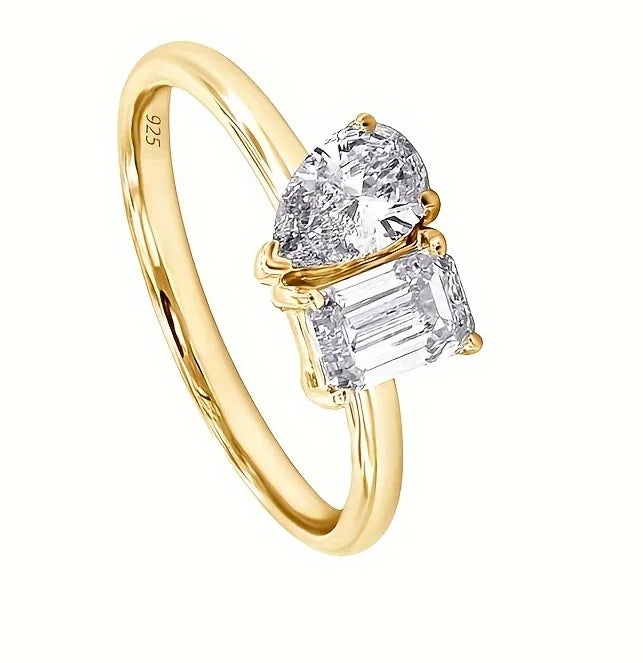 Chaque gemme, taillée avec précision, reflète la lumière avec un éclat saisissant, montées délicatement sur un anneau en métal précieux au fini miroir. L'apparence des deux pierres en forme de poire et de rectangle est mise en valeur par un sertissage discret qui maximise leur brillance. C'est l'incarnation de l'élégance intemporelle, conçue pour marquer les moments les plus précieux.
