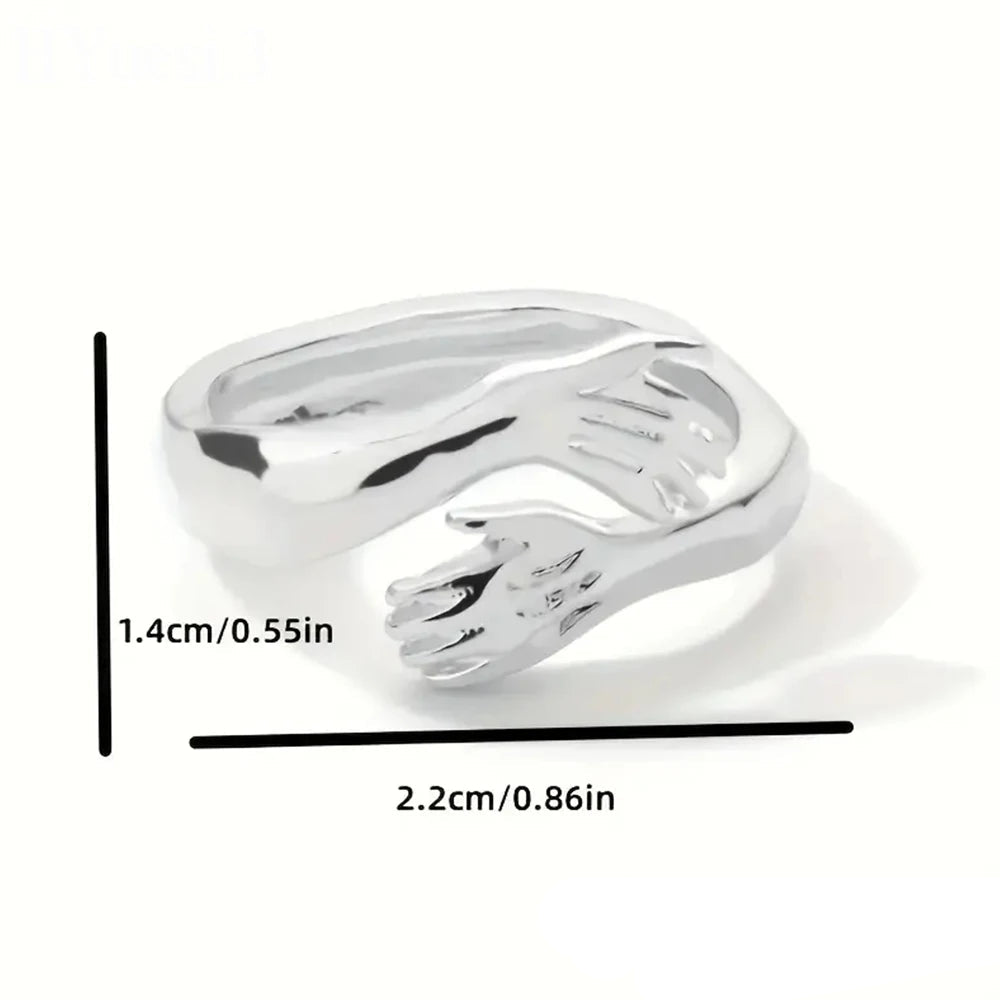 On remarque la finition argentée, brillante et bien détaillée, qui souligne les contours des doigts et la chaleur du geste symbolique. C'est une pièce qui attire le regard non seulement par son originalité mais aussi par la qualité apparente de son rendu. Conçue pour être à la fois stylée et pratique, cette bague de pouce femme est fabriquée à partir d'un alliage de zinc résistant et est disponible dans une palette de couleurs intemporelles, notamment l'argenté que l'on apprécie sur la photo, ainsi qu'une version dorée pour celles qui préfèrent une teinte plus chaude.