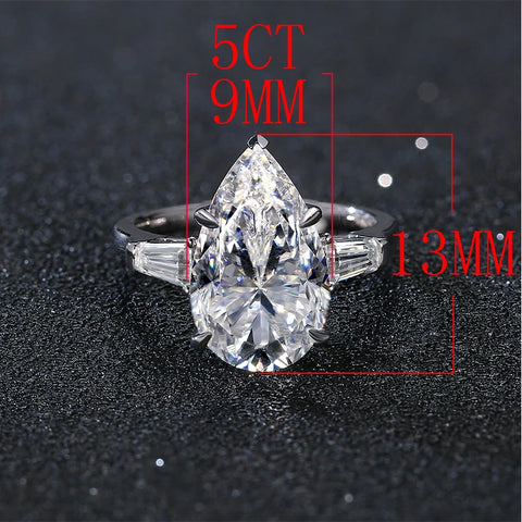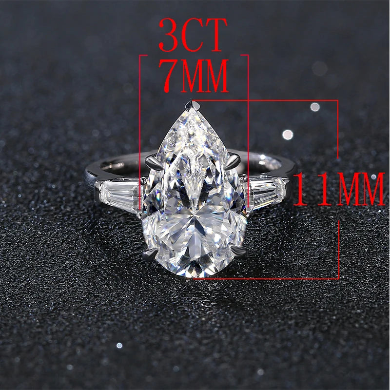 Cette bague en diamant se distingue par son allure majestueuse. Elle met en vedette une éblouissante pierre centrale de taille poire qui maximise la brillance et allonge gracieusement le doigt. De chaque côté de la pierre principale, des pierres secondaires taillées en forme de baguette sont intégrées avec art, ajoutant une structure moderne et un éclat additionnel, encadrant le joyau central dans une harmonie parfaite de lumière. L'anneau, d'un fini poli et raffiné, assure un confort et une présence discrète mais affirmée au doigt, magnifiant l'opulence des pierres.