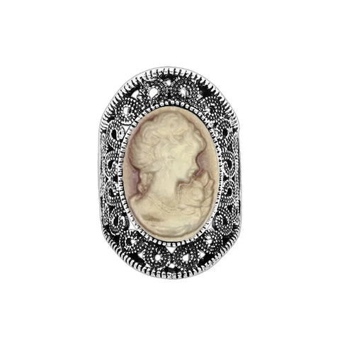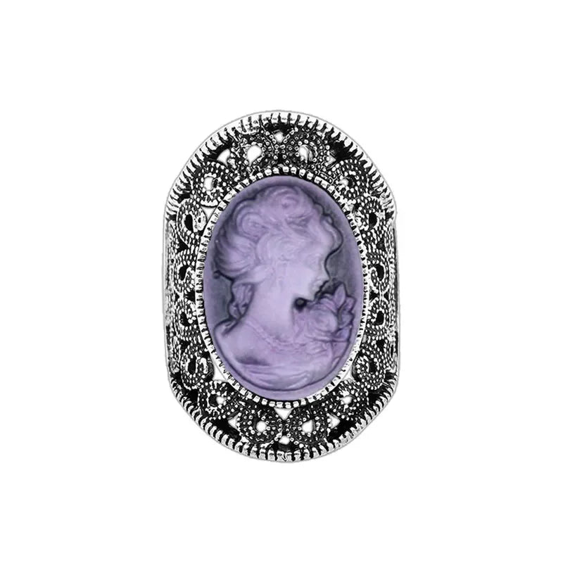 Cette magnifique camée bague se distingue par sa base en alliage de zinc de couleur argentée, sculptée de motifs floraux sur le côté. Au centre, la pierre ovale est un camée en résine, sculpté d'un visage de femme avec un motif floral. Elle est disponible en plusieurs couleurs, ce qui vous permet de choisir celle qui correspond à votre style : bleu, marron, rose et violet.