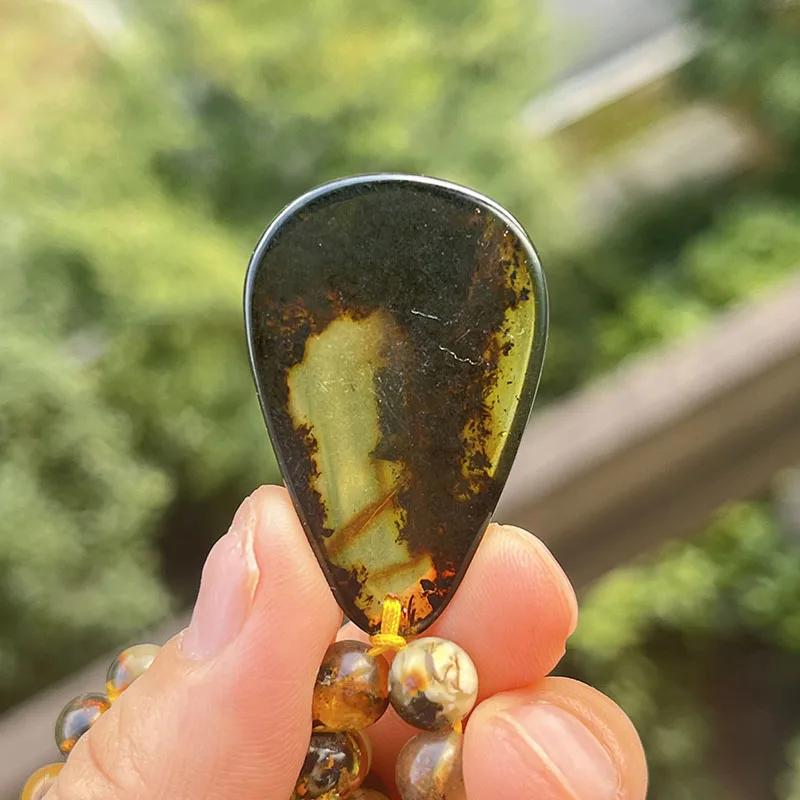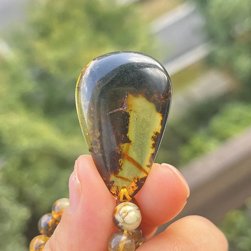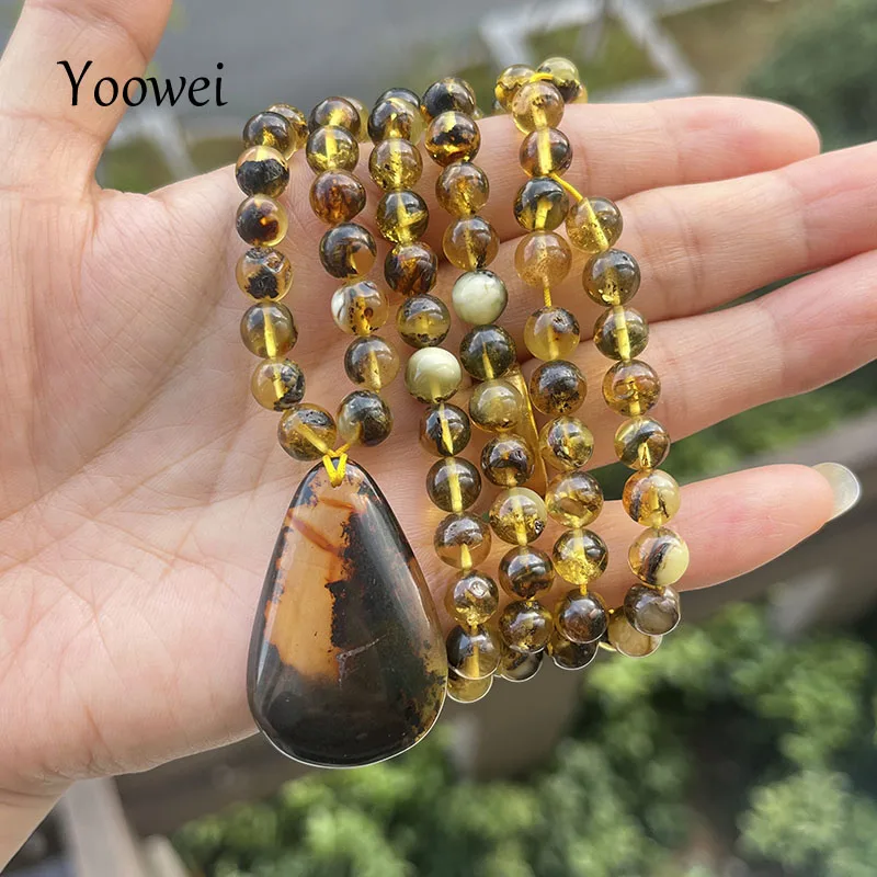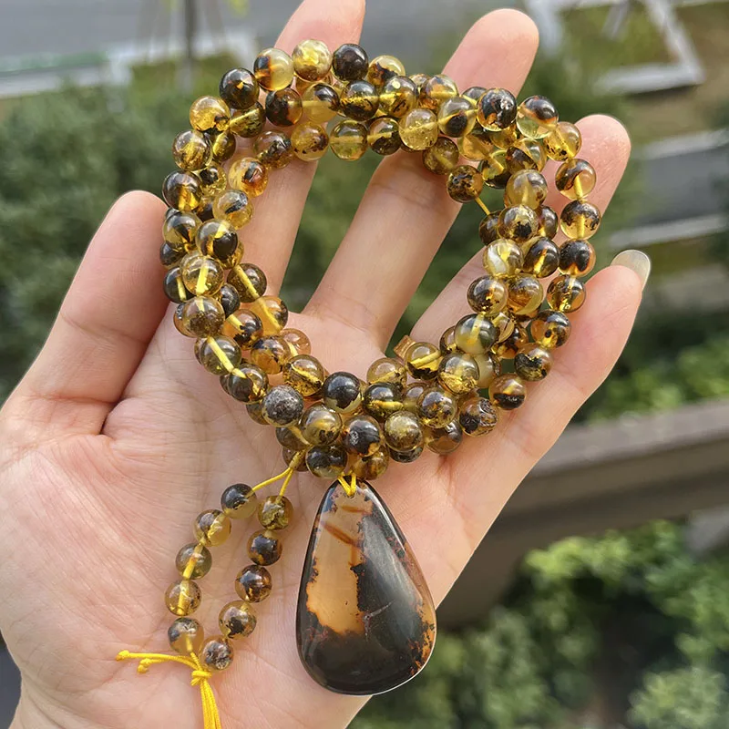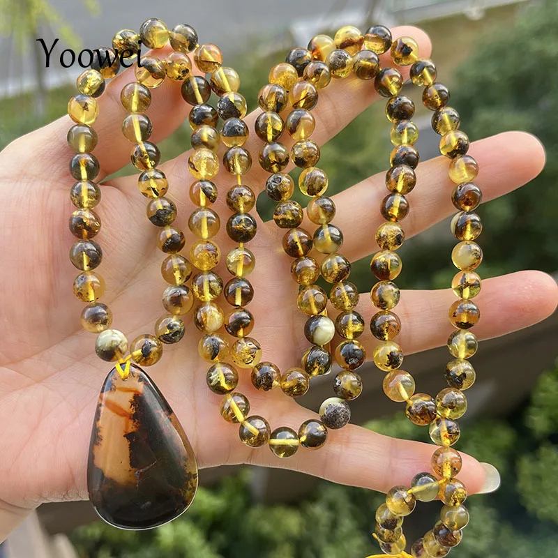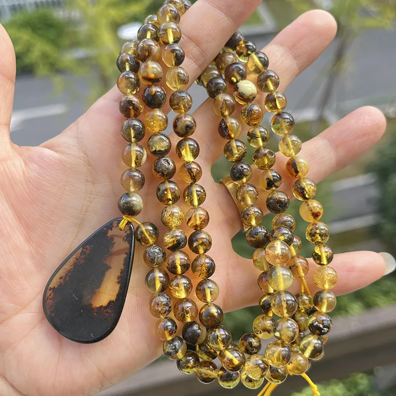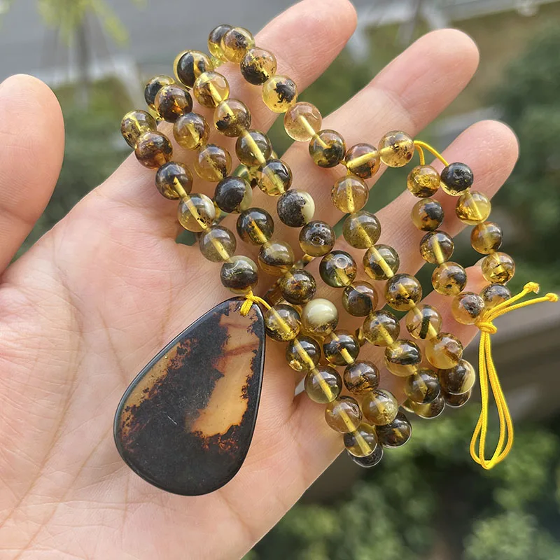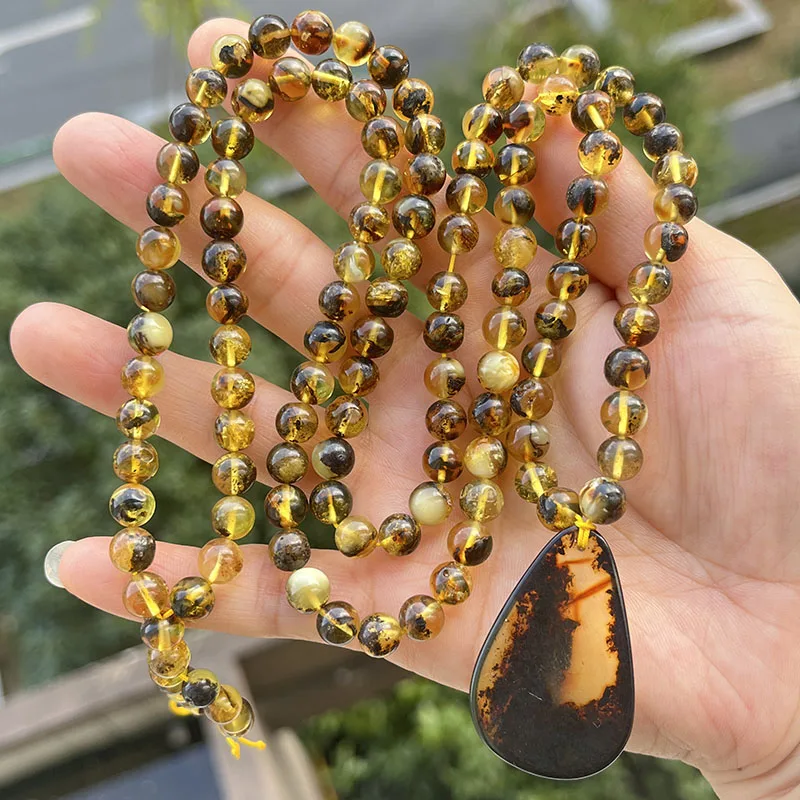 la chaîne d'ambre mesure 76 cm, la chaîne de perles de 6,8 mm avec pendentif pèse 28,5 grammes au total.