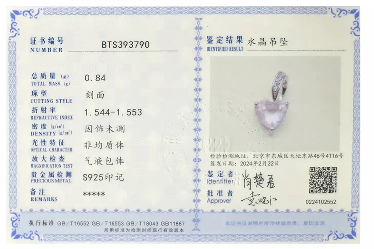 Type de certificat : centre de test des pierres précieuses CUG de Pékin