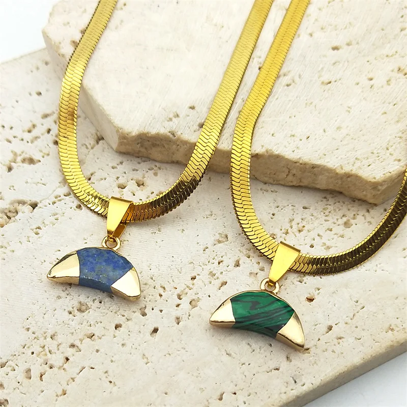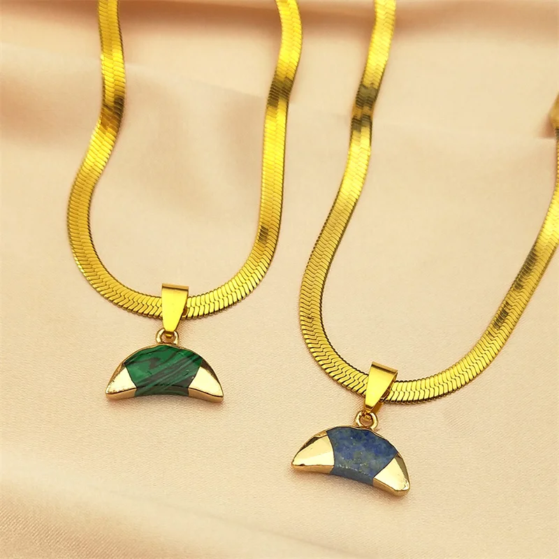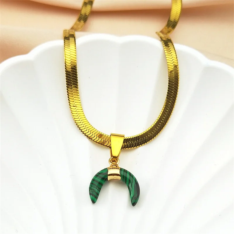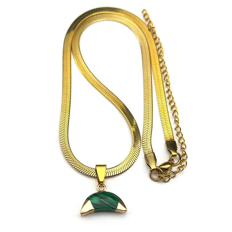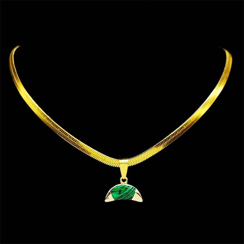 Collier avec pendentif en forme de croissant de lune inversé en pierre de malachite verte classique pour femme et homme, chaîne ras du cou en acier inoxydable couleur or