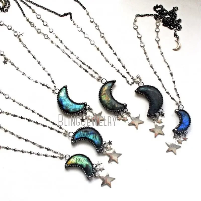 Un collier avec un grand cristal en forme de croissant de lune en pierre précieuse de labradorite sculptée à la main, dans un cadre de soudure en alliage d'argent sculptural fait à la main, qui est à double face, vous permettant de voir les deux côtés de la pierre. Ce pendentif a une frange de charme en forme d'étoile argentée suspendue en dessous. Le pendentif est suspendu à une chaîne mixte faite maison composée d'une petite chaîne en acier en forme d'étoile argentée, de pierres de lunette en cristal à facettes, avec des accents de perles faites à la main.